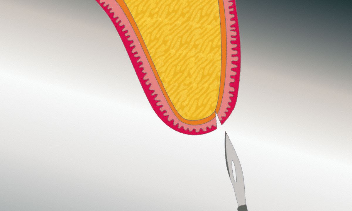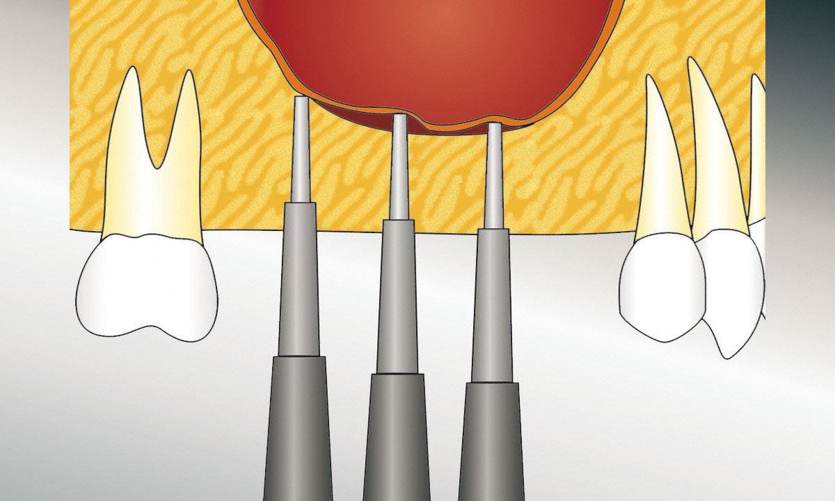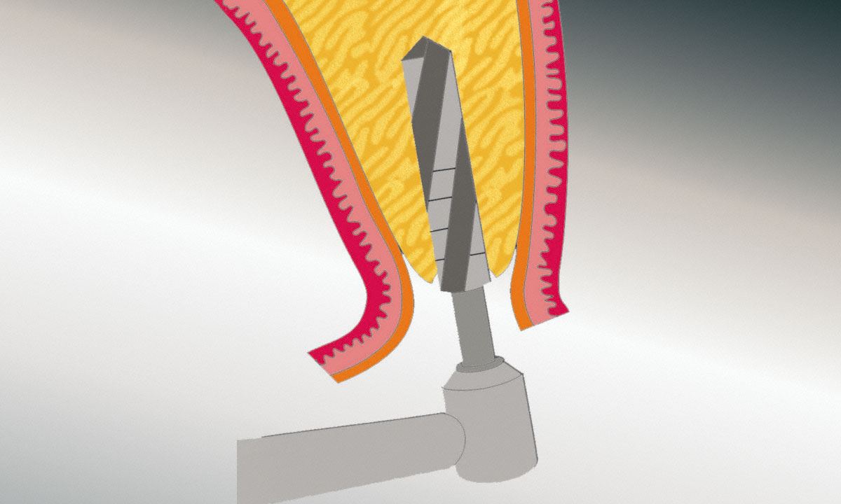 Bei örtlicher Betäubung wird das Zahnfleisch über der geplanten Knochenregion weggeklappt. Mit Hilfe einer kleinen Fräse wird die Plazierung des Implantats bestimmt.