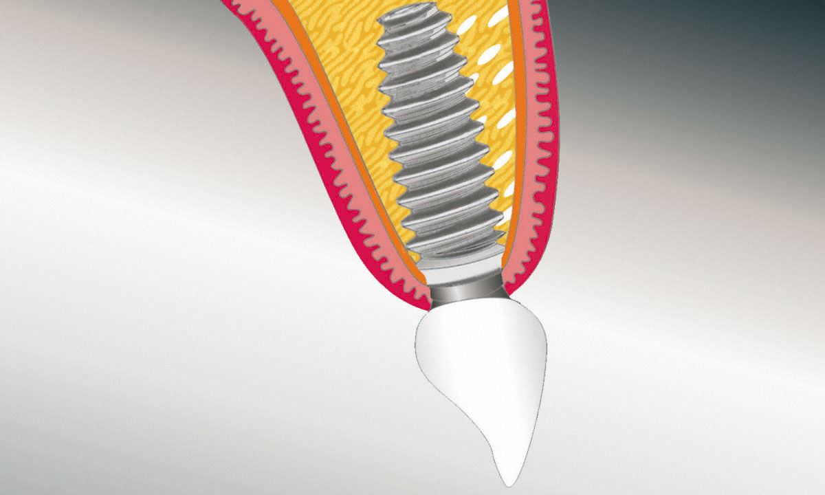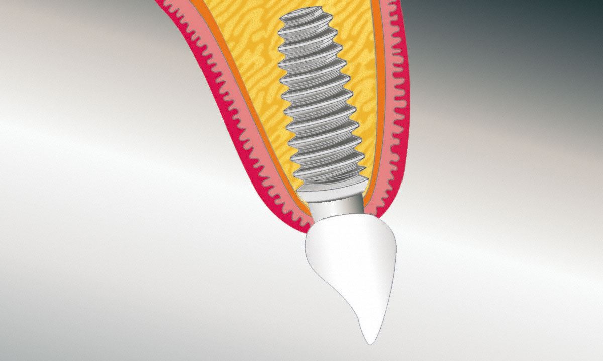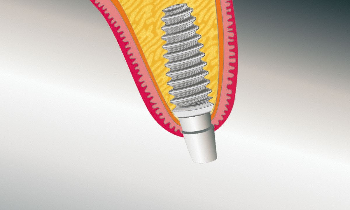 Das sterile Implantat wird dann in den Knochen geschraubt. Die Schleimhaut wird anschließend dicht über der Bohrung vernäht. So kann der Implantatkörper, abgedeckt und geschützt durch das Zahnfleisch, ungestört mit dem Kieferknochen fest verwachsen. Während der anschließenden Einheilphase, die in der Regel drei Monate im Unterkiefer, sechs bis acht Monate im Oberkiefer dauert, bleibt der Implantatkörper vom Zahnfleisch abgedeckt.