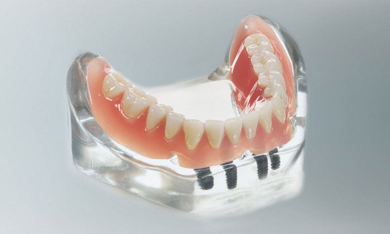 Besonders im Unterkiefer ist der Halt einer totalen Prothese problematisch. Oftmals werden Sprache und Kauen durch den problematischen Sitz stark beeinträchtigt. Vier Implantate geben dem totalen Zahnersatz guten Halt.