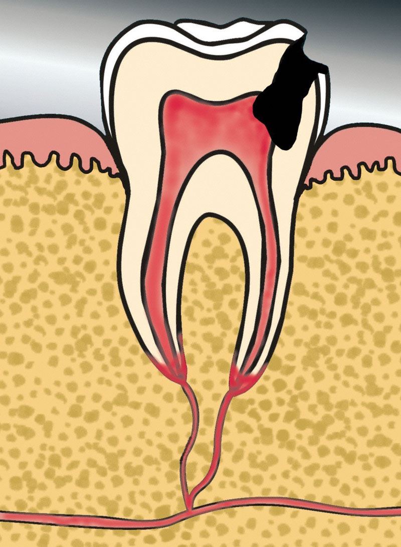 Der gesunde Zahn besteht aus einer äußeren Schmelzschicht. Der innere Bereich des Zahnes gliedert sich in die Bereiche Dentin und Pulpa auf. Das Dentin liegt unter dem Schmelz. Im Innersten befindet sich das Gefäß-Nervenbündel, die Pulpa. Der gesunde Zahn sollte von einem gesunden Parodont umgeben sein.