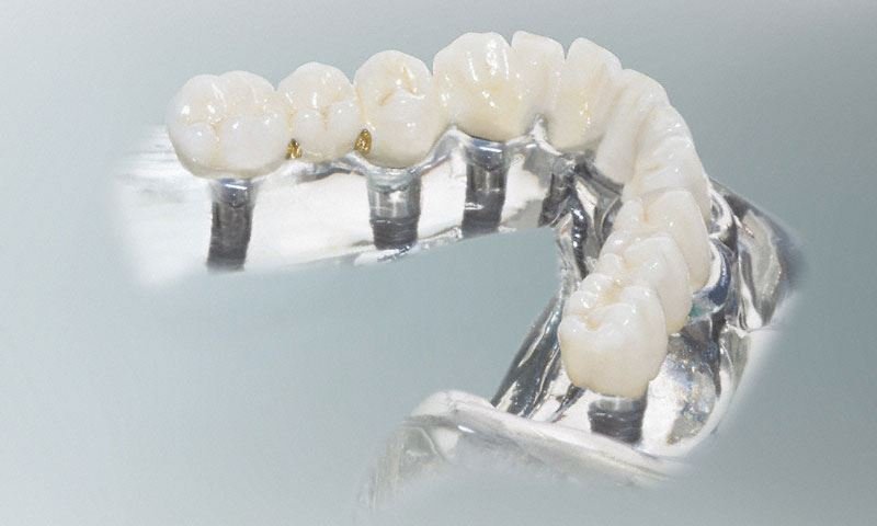 Der Zahnersatz wird vom Zahntechniker im Zahnlabor erstellt. Da jetzt der Implantat-Körper fest im Kieferknochen verankert ist, kann der endgültige Zahnersatz (Krone, Brücke oder Prothese) mit dem Implantatkörper verbunden werden. Der implantatgetragene Zahnersatz hält sicher und fest.