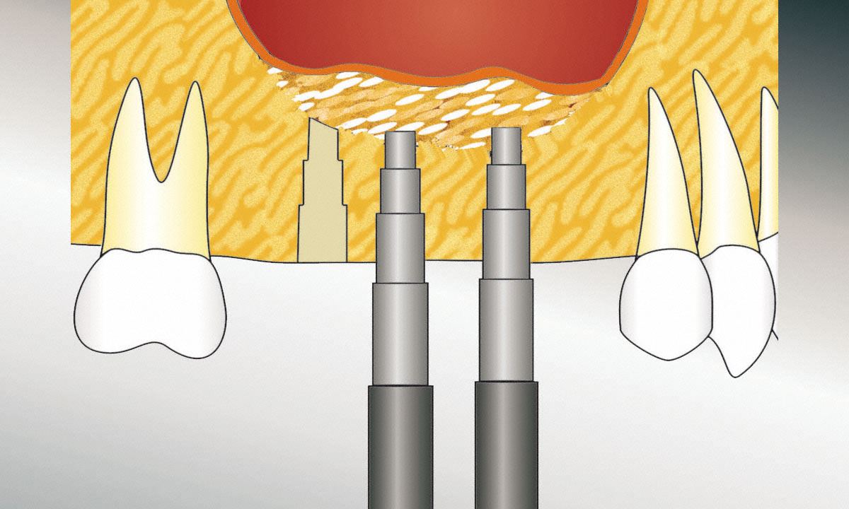 Mit einem dünnen Pilotbohrer wird dann die Position des Implantats festgelegt. Mit verschiedenen Fräsen wird die Knochenbohrung präpariert, die exakt auf die Größe des Implantats abgestimmt sein muss.